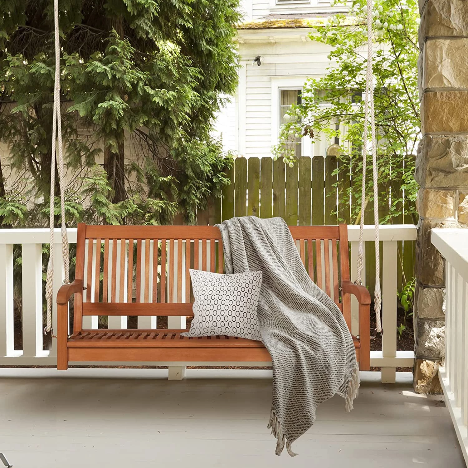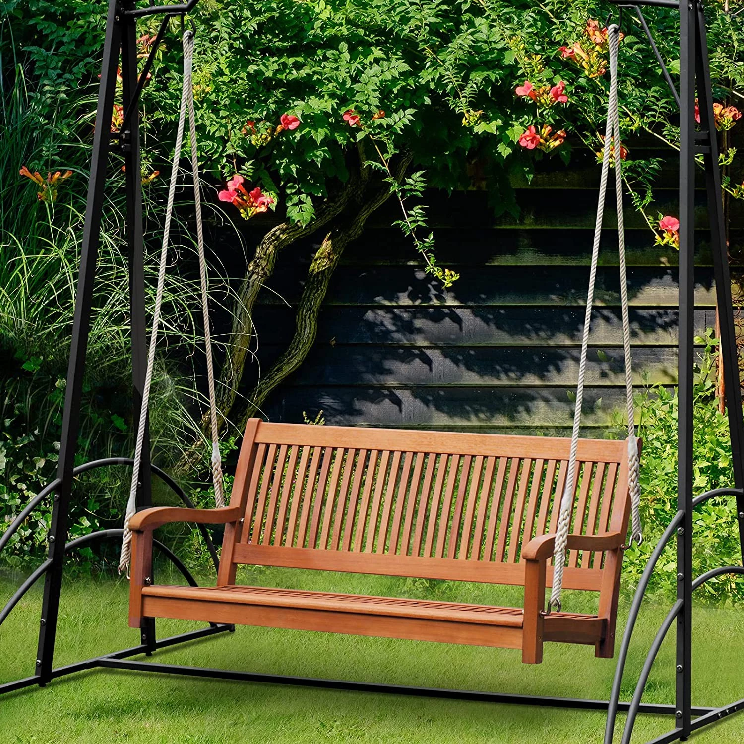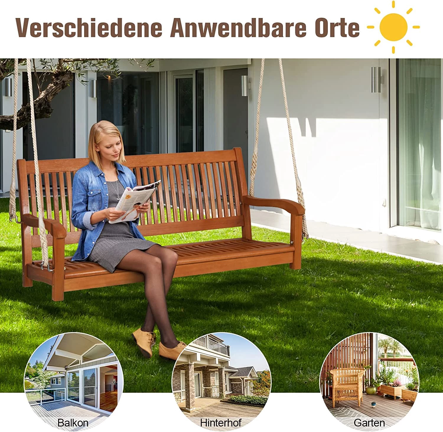 【Vielseitige Verwendung】 Durch ihr elegantes Design ist die Bank eine schöne Ergänzung für Balkone, Gärten, Pools und Innenbereiche. Jedes Seil ist 3 m lang. Sie kann je nach Wahl an der Decke oder einem Gestell aufgehangen werden.